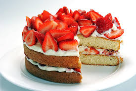 Partir el pastel por la parte ancha para conseguir dos tortas delgadas. Esparcir encima de la parte inferior una mezcla de fresas con crema batida. Cubrir con la parte superior.